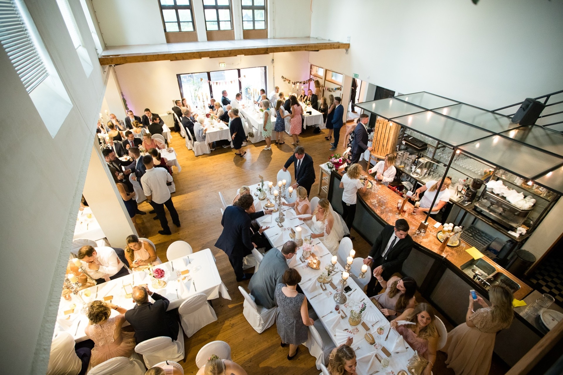 Die Schlossallee 1 bietet flexiblen Platz für 30 bis 300 Gäste auf zwei Etagen. Der Hauptsaal eignet sich für größere Veranstaltungen, während das Bistro intimere Feiern ermöglicht.